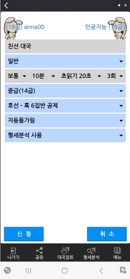 처음으로 입장하셨다면 일단 기력설정부터 하세요. 설정하고 나서 바로 보이는 낯선 화면에 정신이 없으실 텐데 초보자라면 A.I대국을 먼저 하시길 추천드려요. 타이젬 바둑은 A.I 대국이 있어서 다른 사람과 대국하기 부담스러우신 분들은 맨 아래 하단에 A.I대국에 먼저 들어가서 연습하실 수 있습니다.